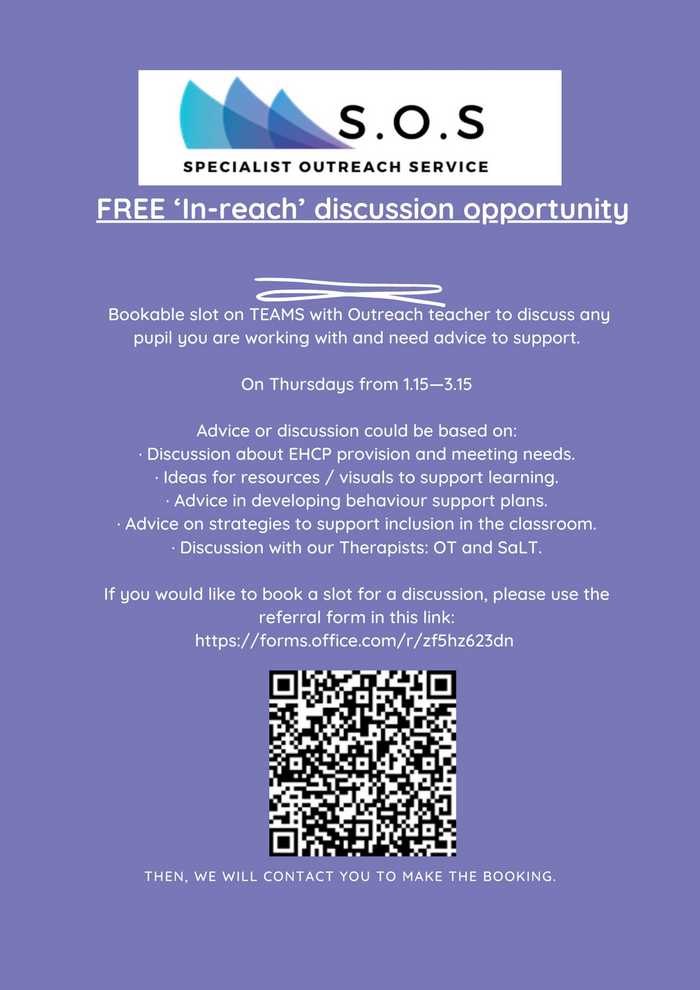 - Visits to specialist setting to observe strategies and approaches in practise – in-reach